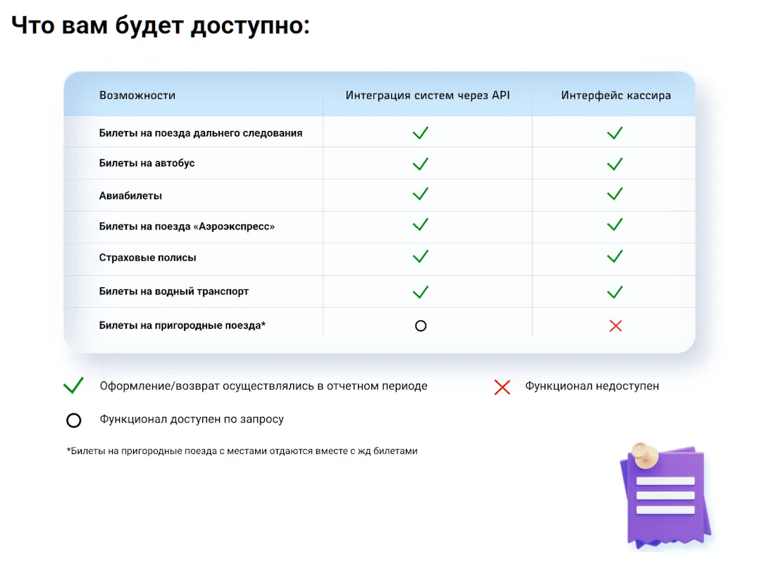 | Железнодорожные билеты | Доступ к АСУ «Экспресс-3», спецтарифы РЖД и поддержка сложных маршрутов. |