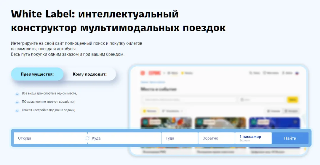 Высокотехнологичная экосистема, обеспечивающая прямой доступ к ресурсам РЖД, авиаперевозчикам и автобусным сообщениям для автоматизации туристического бизнеса любого масштаба.